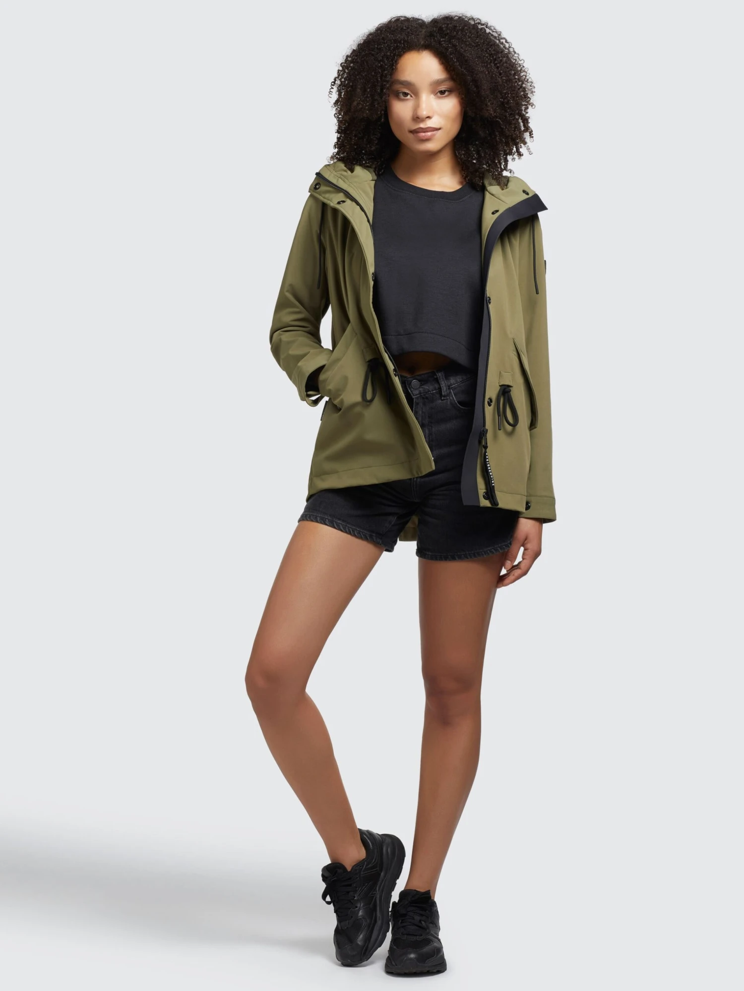 – hoch schließende Kapuze mit Kordelzug